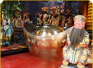 『五路財神』為天官中路武財神『金龍如意正一龍虎玄壇真君』-趙光明,天官東路武財神『招寶天尊』-蕭升,天官西路武財神『納珍天尊』-曹寶,天官南路武財神『招財使者』-陳九公,天官北路武財神『利巿仙官』-姚少司。『五路財神』掌管天下四方財庫,買賣求財;『五路財神』能宜利和合,但求公平公正。其為司財和與人致富的功德,深為世人商賈最崇信的神明。